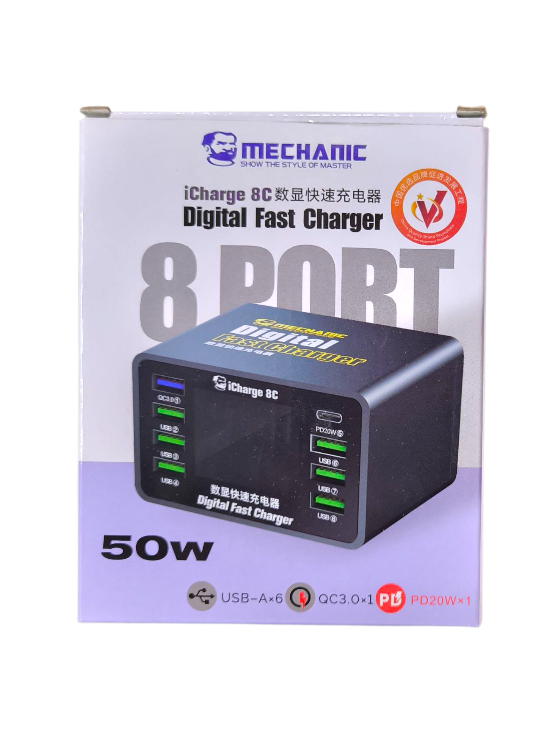 مولتی شارژر ICharge 8C مکانیک –  یک ابزار مفید برای شارژ کردن همزمان چند دستگاه مختلف می‌باشد. این مولتی شارژر، برای تعمیرکاران موبایل ابزاری بسیار مهم و کاربردی است و با استفاده از این محصول کاربر می‌تواند بدون معطلی چندین گوشی را به صورت همزمان شارژ کند، همچنین یکی از قابلیت‌های اصلی این محصول استفاده از تکنولوژی شارژ بسیار سریع یا Super Fast Charge است که نیاز انواع گوشی‌های هوشمند را برطرف می‌سازد. پشتیبانی از انواع دستگاه‌های مختلف اندروید و آیفون، تبلت‌ها و ساعت‌های هوشمند از دیگر ویژگی‌های این مولتی شارژر است.